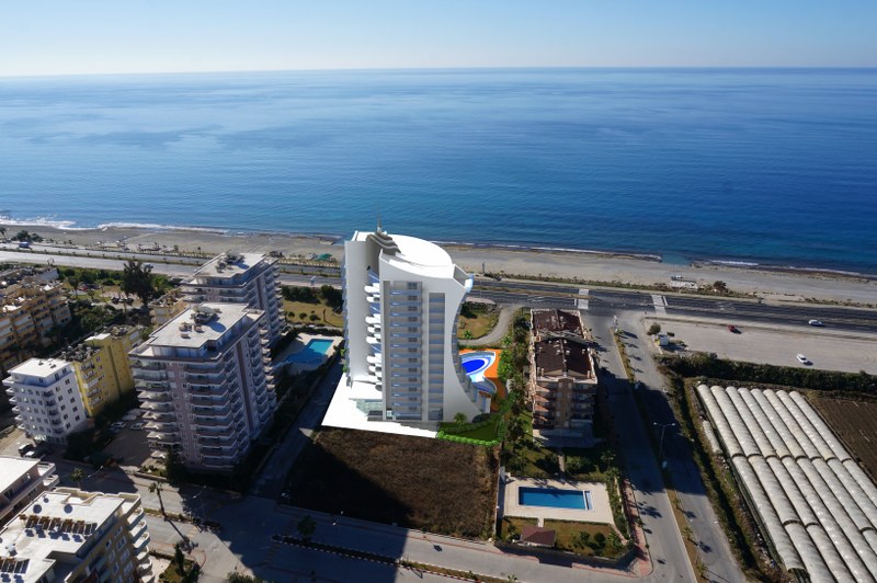 This luxurious project is built on the first line of Mahmutlar, where you will find complete peace just 25 meters from the Mediterranean Sea. Whatever you are looking for your holiday, for a long stay or rent your apartment can be found in this project. There are shops, restaurants, SPA-salons. The area around the project makes it possible to take a walk in the mountains or relax on the beach/