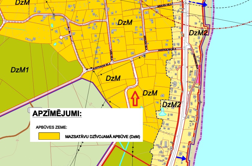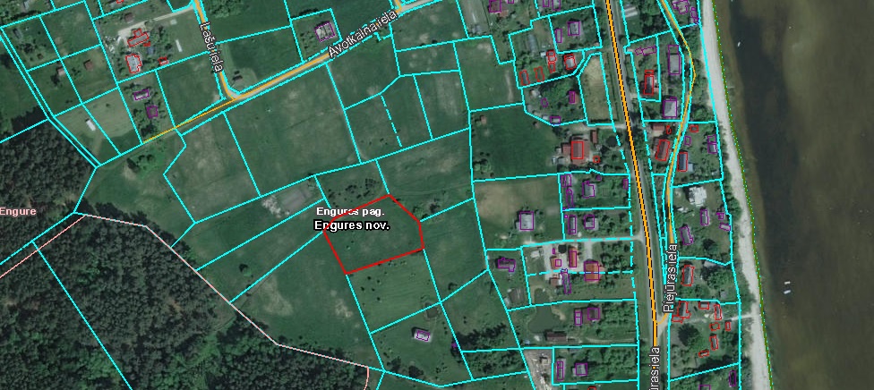Недвижимость находится в Энгуре. Часть земельного участка (у северных и западных границ) предназначена для дороги/постройки улицы и на фиксированном расстоянии от границы, установлена красная линия. Эта территория, которая предназначена для улицы и которую нельзя застраивать. Застройку можно начинать в 6 метрах во внутрь от линии застройки. На других границах застройку можно начинать в 4 метрах от линии застройки. Для подъезда есть дорога (указанная на плане). Трансформатор для подключения электричества находится близко. Стоимость подключения составляет 2500 евро.