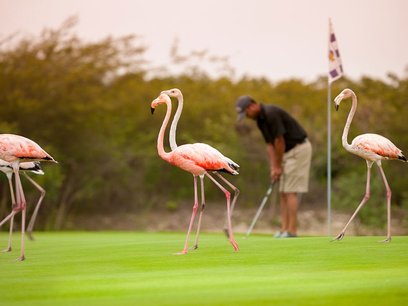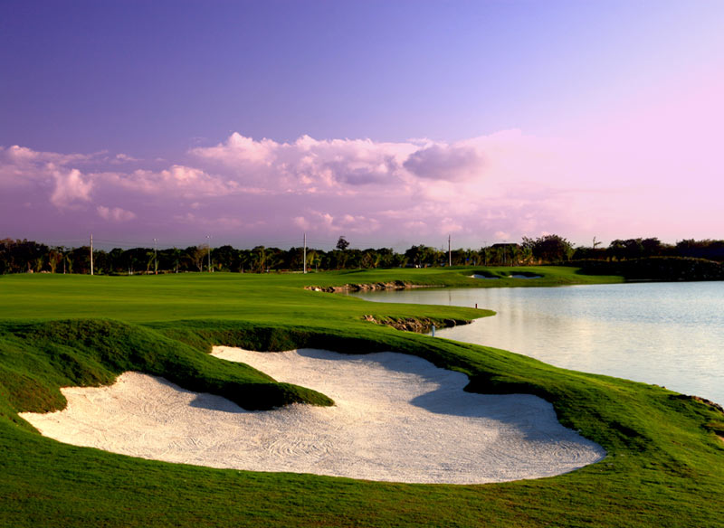 -Jack Nicklaus Golf course with a panoramic view , set in a backdrop of tropical lush greenery and palm trees.