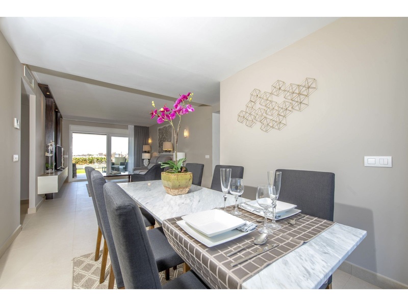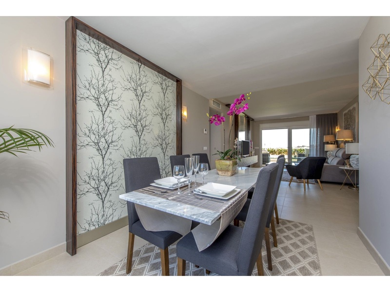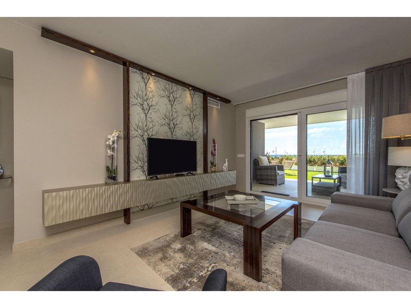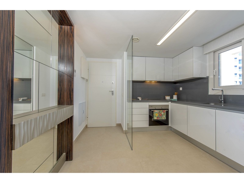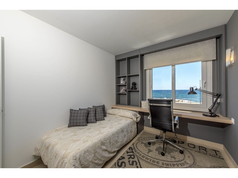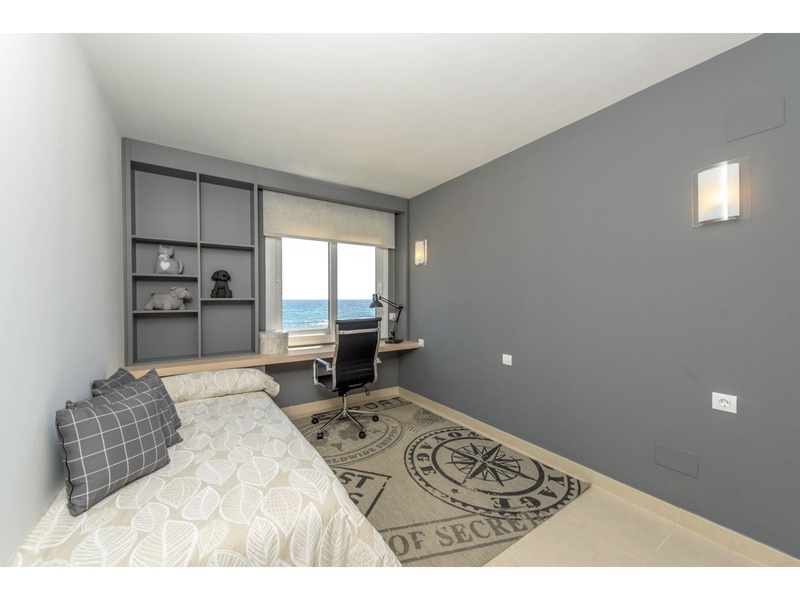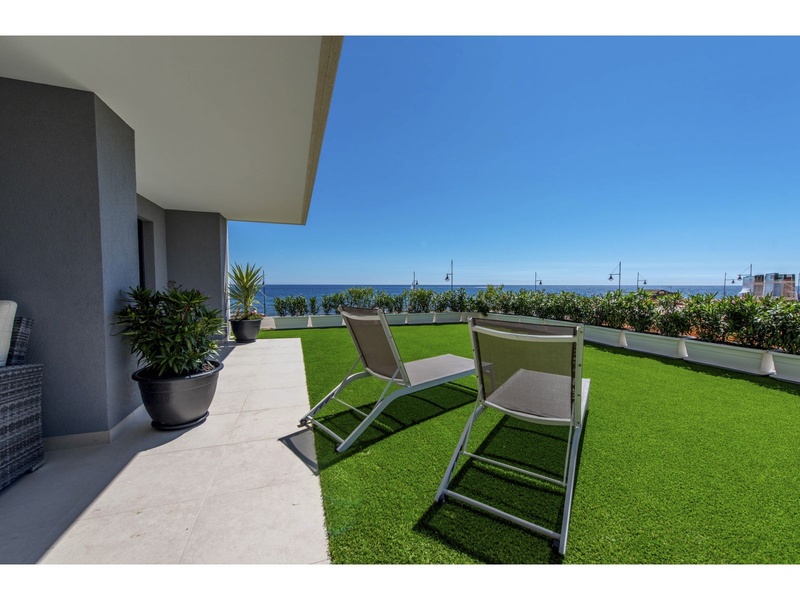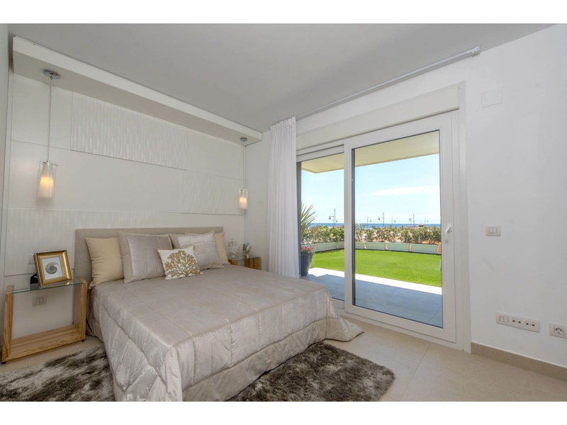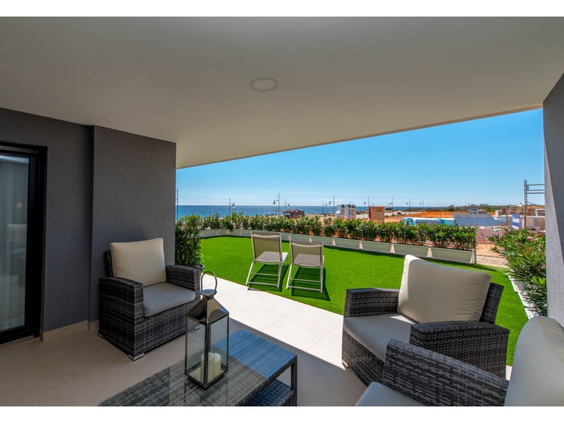 New apartment in the first line from the sea, with outstanding panoramic views to the Mediterranean, Off-plan property. Modern apartment on the ground floor with a total surface built area of 159,25 square meters, divided between 2 bedrooms, 2 bathrooms, a living-dining room, an independent kitchen, 2 terraces that occupy 24,30 square meters and 62,65 square meter of private gardens. The property disposes of an underground parking space and a storeroom. Double orientation with breathtaking sea views from the main bedroom and the living room, and views to the urbanization of Punta Prima from the second bedroom and the kitchen. The construction materials of the best qualities. The kitchen and the two bathrooms are fully furnished and equipped with appliances, fitted wardrobes in both bedrooms, armored main entrance door and with a security lock, motorized blinds, double glazing, hot water with renewable contribution, underfloor heating in the bathrooms, installation of air conditioning and heating by ducts, video intercom, pre-installation of alarm. Private urbanization with communal gardens, 3 communal swimming pools (infinity, heated and for childre), Jacuzzi, children's playground, sports area and underground parking. The building with lifts, accesses for people with reduced mobility and security systems.
