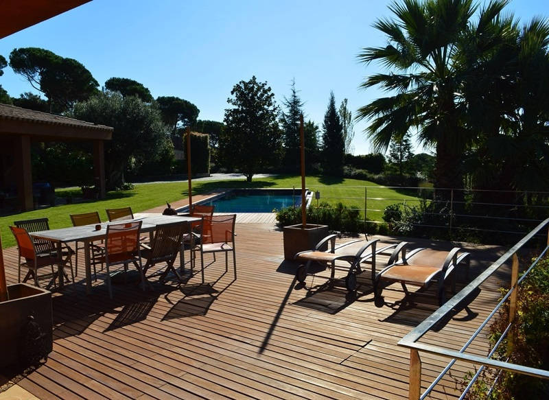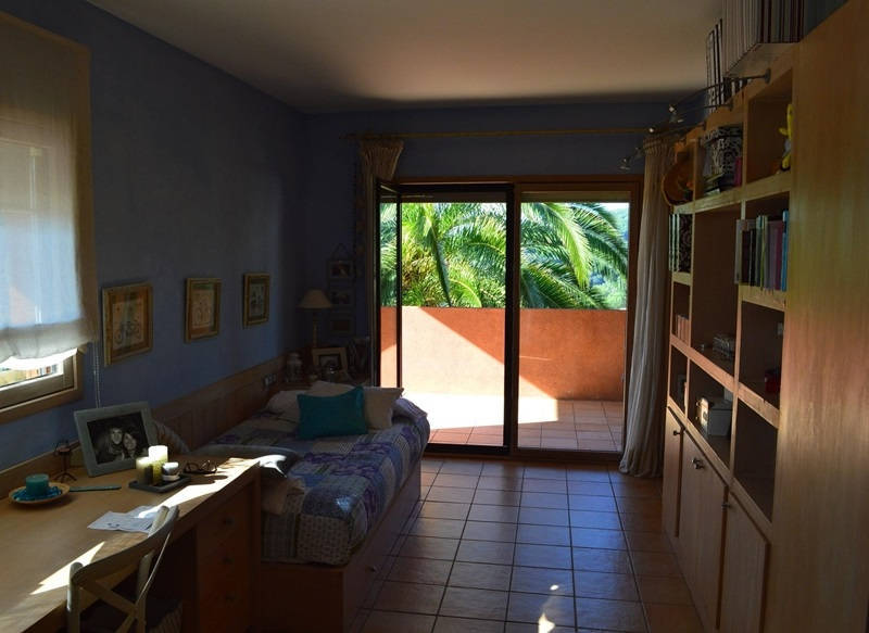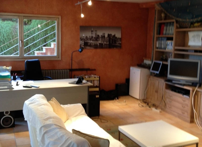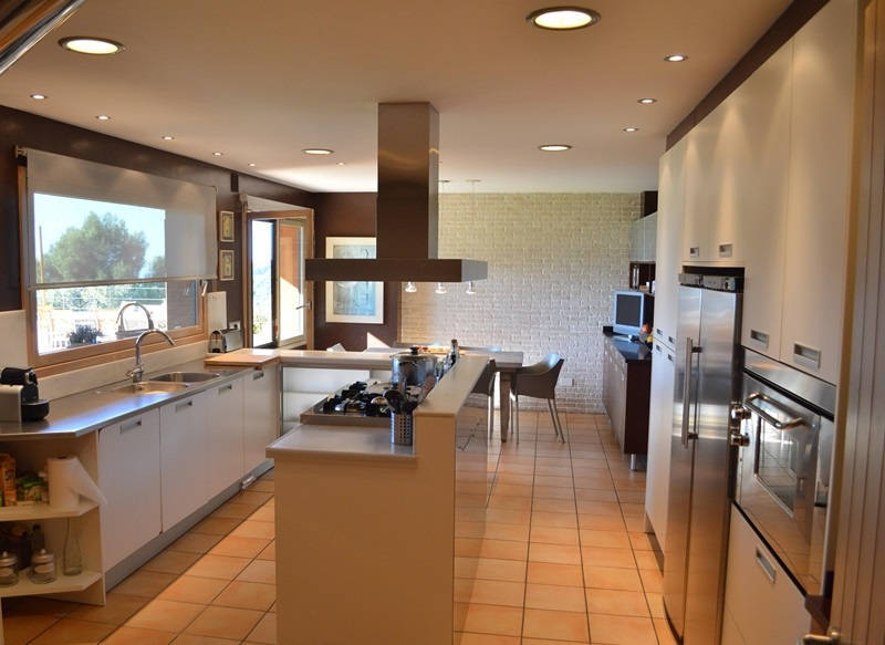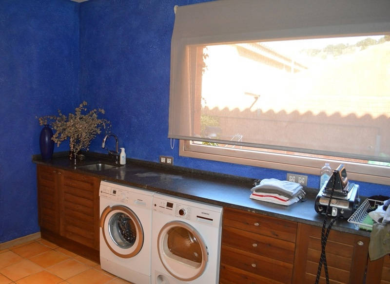 Просторная гостиная со столовой и выходом на террасу и в сад к переливному бассейну 12х4, оборудованная и полностью экипированная кухня с островом, три супружеские спальни с ванными комнатами, ещё одна спальня, ванная комната и кабинет, прачечная.