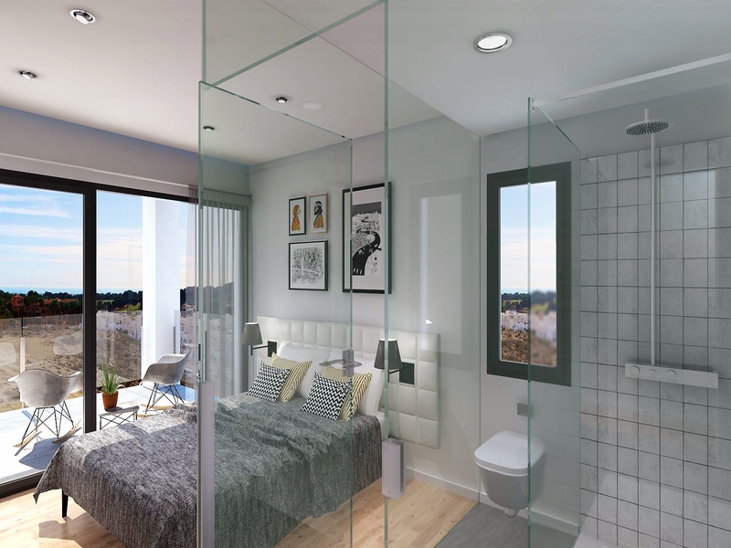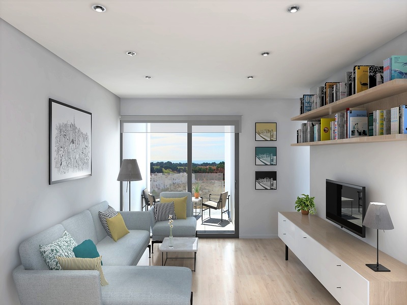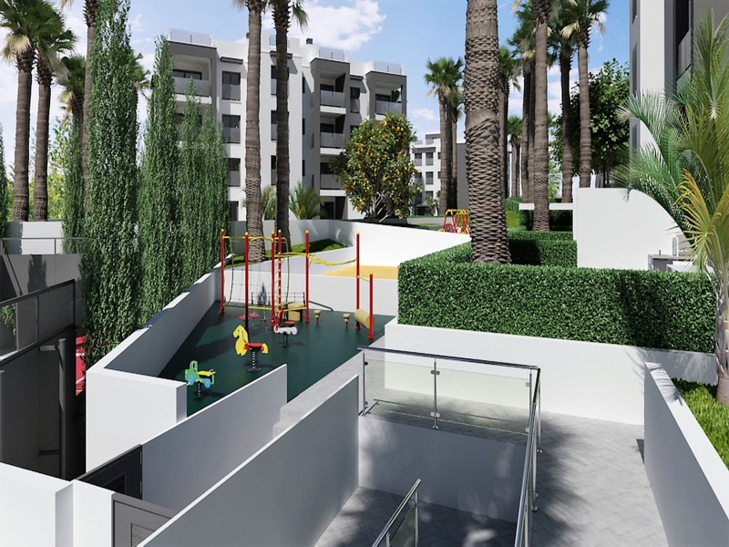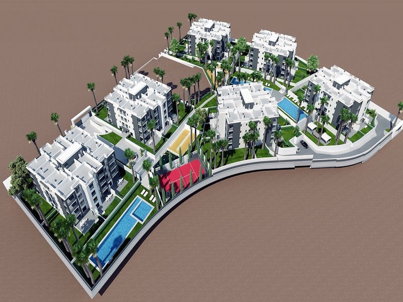 Apartments for sale in the 2nd of the 6 blocks of a new project in Villa Martín, in Orihuela Costa. The complex is located at only 200 meters from the prestigious golf courses Villa Martín. This is a private residential complex with common gardens, swimming pools, children's playgrounds and an underground parking. All apartments dispose of 1 or 2 bedrooms, 2 bathrooms and a parking space at the underground parking. Apartments located on the ground floor also dispose of their own garden areas adjacent to the apartments. Apartments on the upper floors have their own private terraces on the top of the building.
