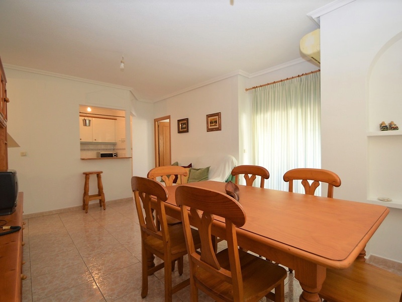 Flat for sale in Torrevieja, on the second line in 100 meters from the beach of Playa del Cura. The apartment occupies the corner of the first floor of the building. It has two bedrooms, a large living room with an american kitchen, one bathroom, and a terrace with a side sea views. Very bright rooms with large windows, all overlooking the street. The apartment was renovated 2 years ago and is in immaculate condition. Sold with all furniture and household appliances, ready to move in any time. The building itself is also very well maintained, with an elevator and a common terrace. The most convenient location. All kinds of services nearby. Ideal for living throughout the year or spending holidays, enjoying the sun, the beach and Mediterranean kitchen.