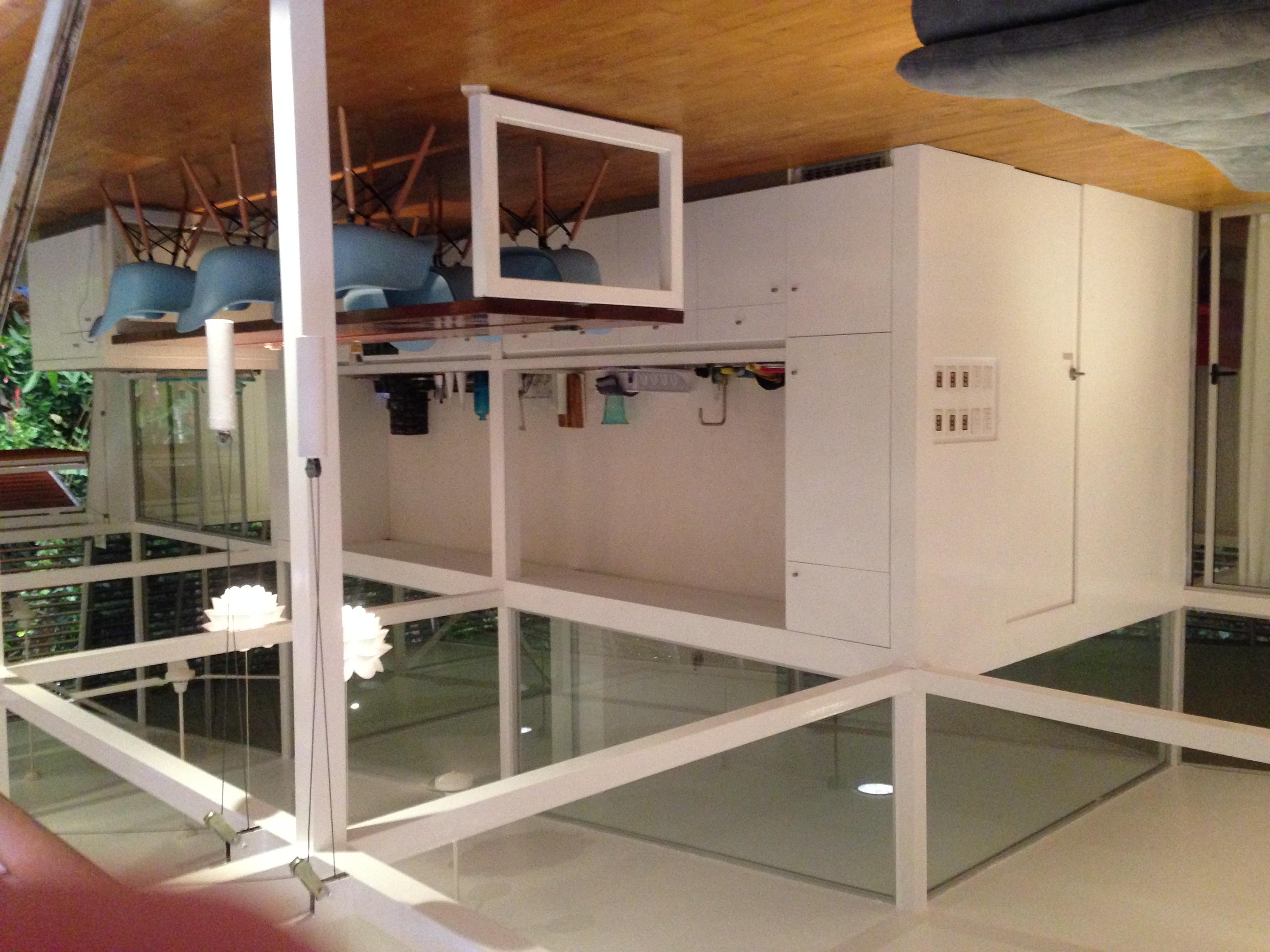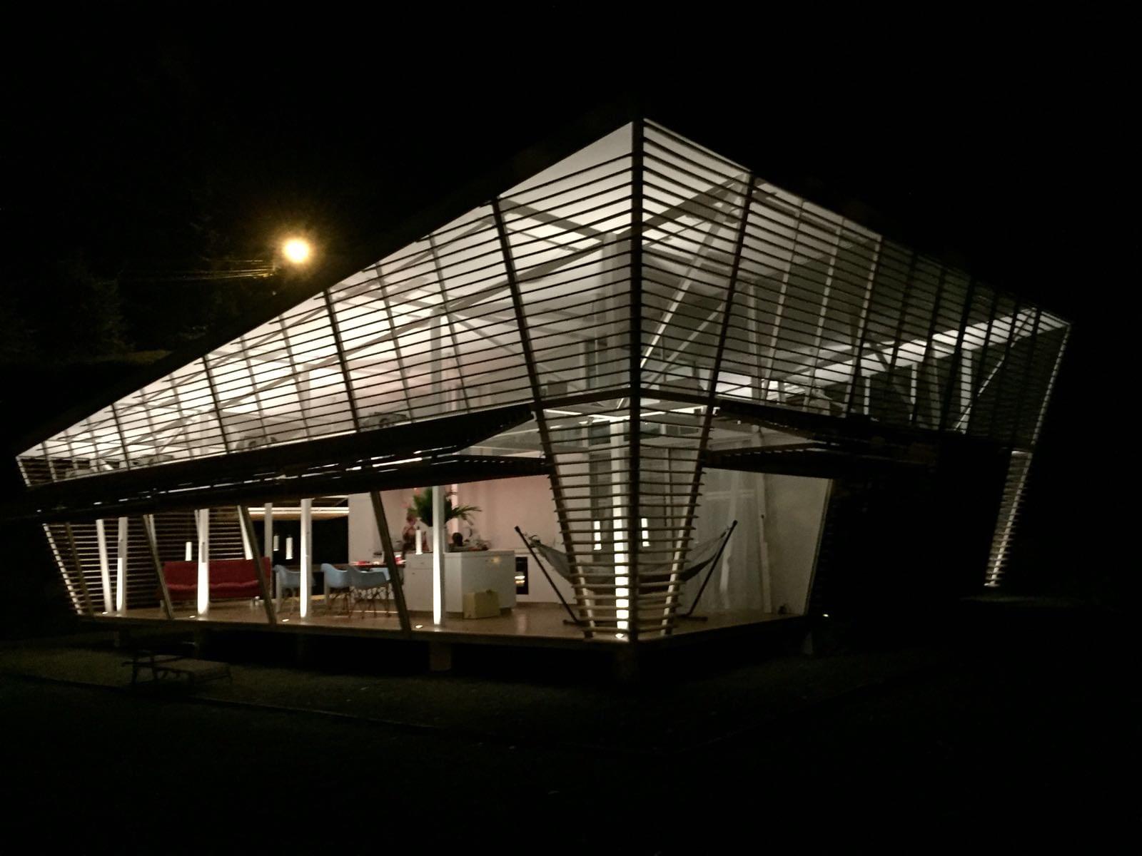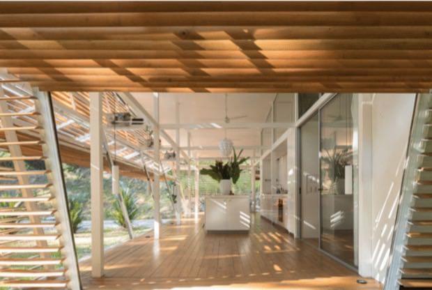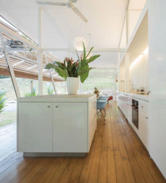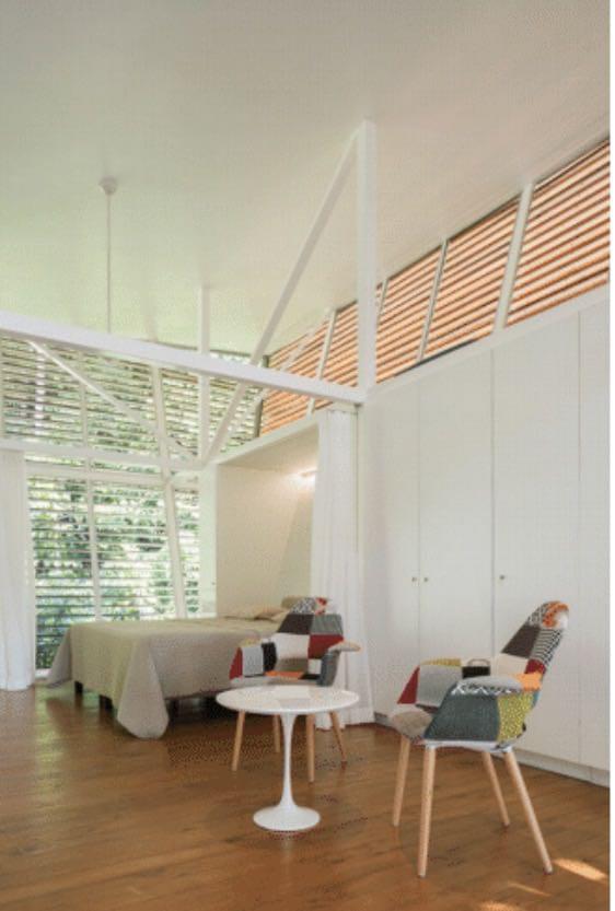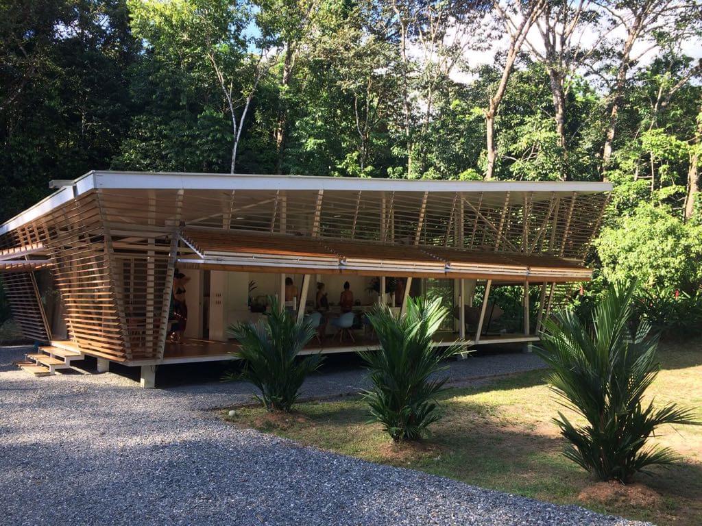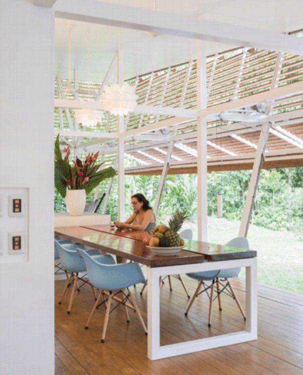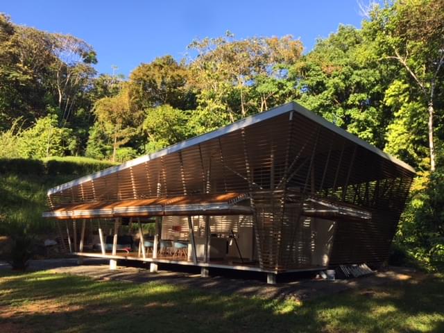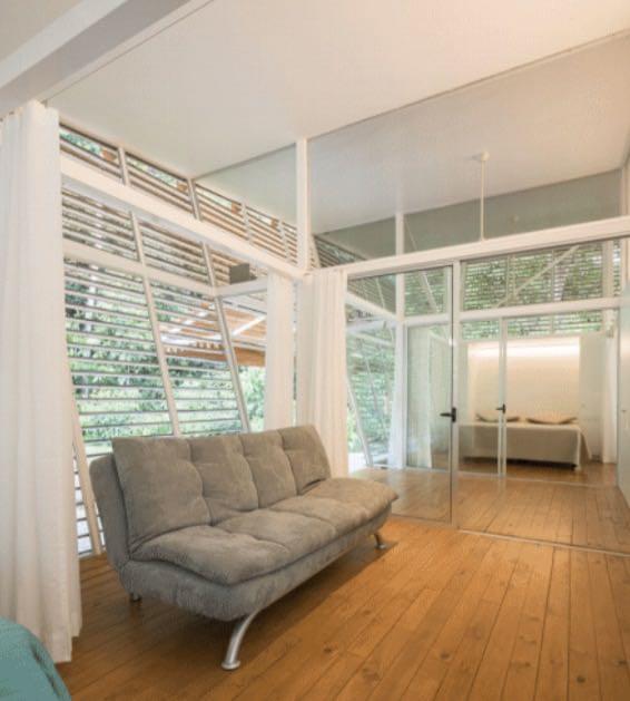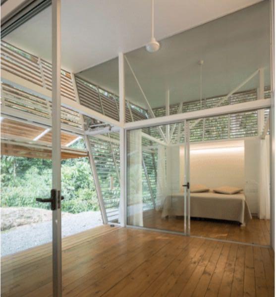 This house is a very unique concept with high quality finishes, the unique design by an internationally recognized German architect who lives here in Costa Rica, has an emphasis on natural cooling by air flow and security. Areas of the exterior walls are hinged to fold horizontally, creating an open terrace effect throughout the entry, living and dining areas. All exterior walls are louvered providing the airflow and constant exposure to the nature outside. There is no need for air conditioning nor are there any exterior windows in the design.\r\rA Master Suite with private bath and second bedroom with bathroom adjacent both are furnished with King Beds and have sitting areas. Furnishings include two futons for additional sleeping accommodations.\r\rThe trained eye will take note of the fine German and Italian kitchen appliances and equipment, as well as the high caliber cabinets and other finishes throughout the house.\r\rThe property is very private with a peaceful forested nature setting, location is convenient to Ojochal services and restaurants, much of which are easy walking distance. No rattling up miles of bumpy road, this location is just minutes from the highway.\r\rWith no need for A/C (if you don’t believe, schedule your visit for the hottest part of the day), solar hot water system and features such as solar tubes providing ambient light in both bathrooms all day, your electric bill for this home is negligible.