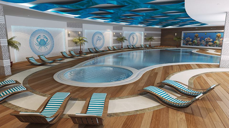 For water entertainment complex will have pools - outdoor infinity pool with a waterfall from the central unit to the reception area on the first level and a private basseyns whirlpool spa area, slides, sauna, Turkish bath, Finnish steam room and even special recreation room with ice and salt.