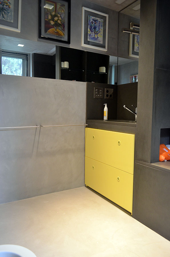 The sleeping area has two suites also characterized by large windows, each accompanied by its own bathroom made of concrete of the moon and glass and a dressing-closet. These two suites accompanied by a service area comprising a room and laundry / ironing service as well as bath service/guests.