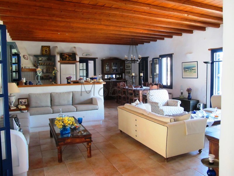 Unique single house for sale in Paros closed to the main port: Paroikia. In a great land of 4000sqm, the house of 220sqm is nicely arranged on one level. There are a total of 5 bedrooms with bathroom en-suite, a spacious living-sitting room with open space kitchen, and in the center of the house, next to the pool, a very clever sitting area with barbecue and wooden oven, which can be open from either side and remember the traditional Greek style.
