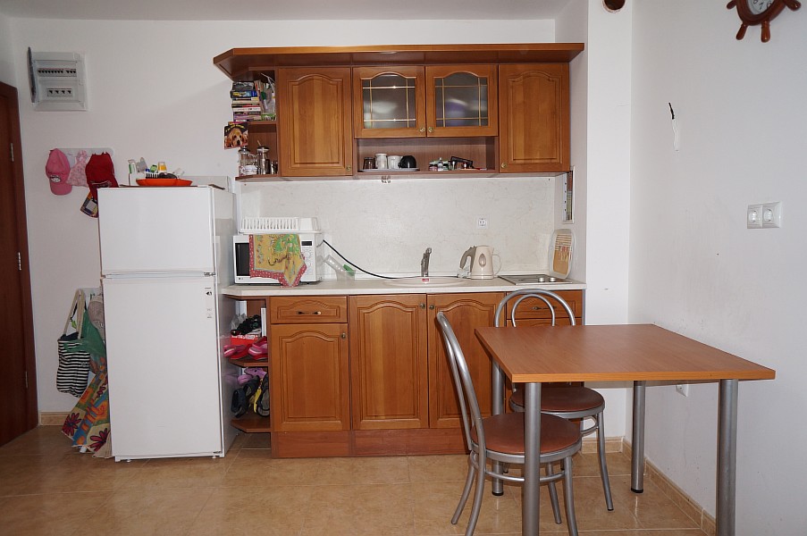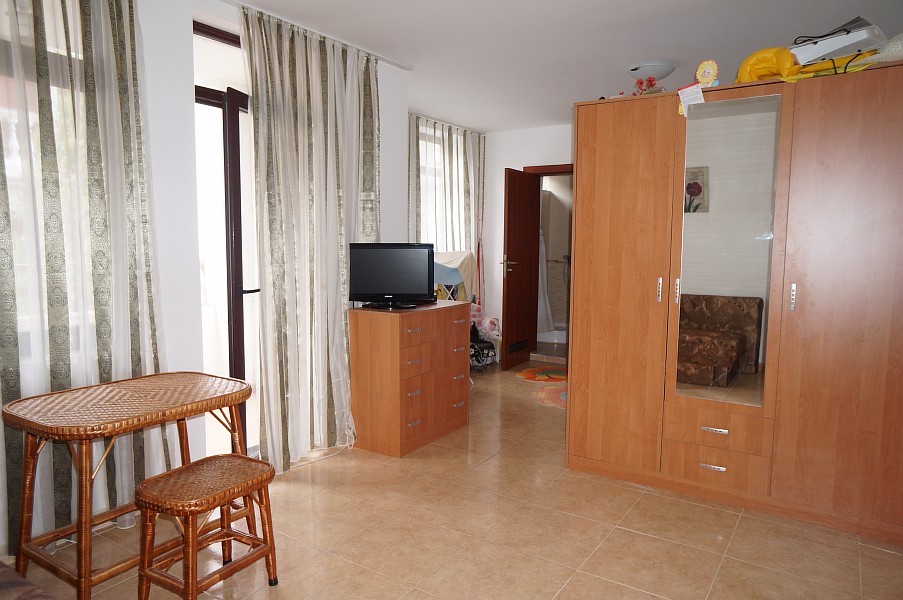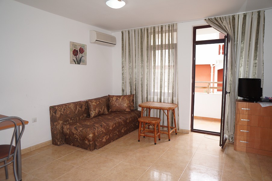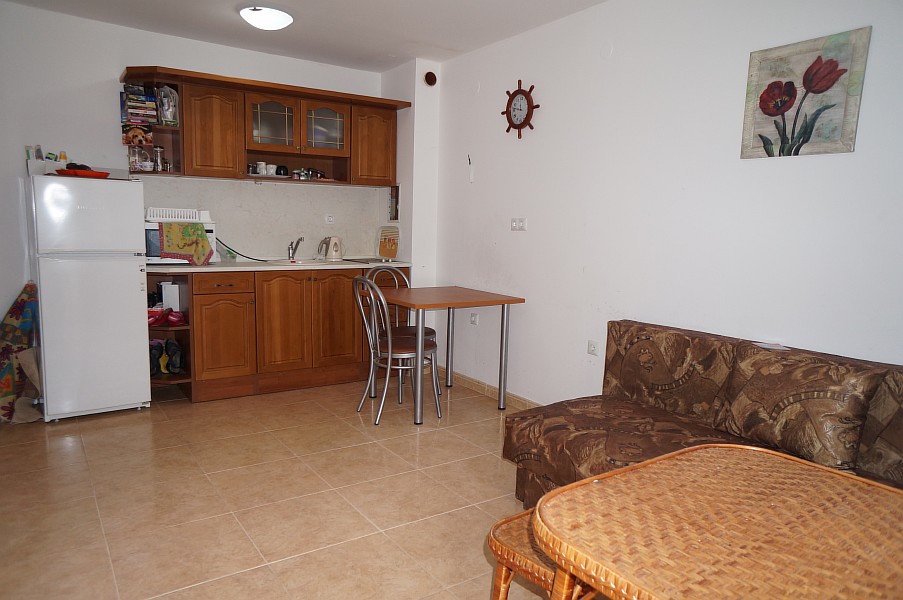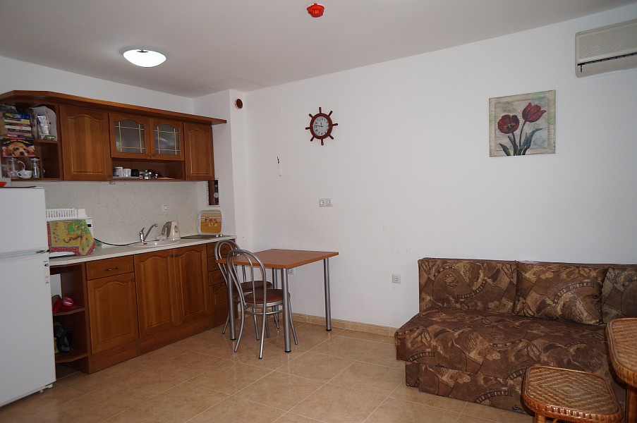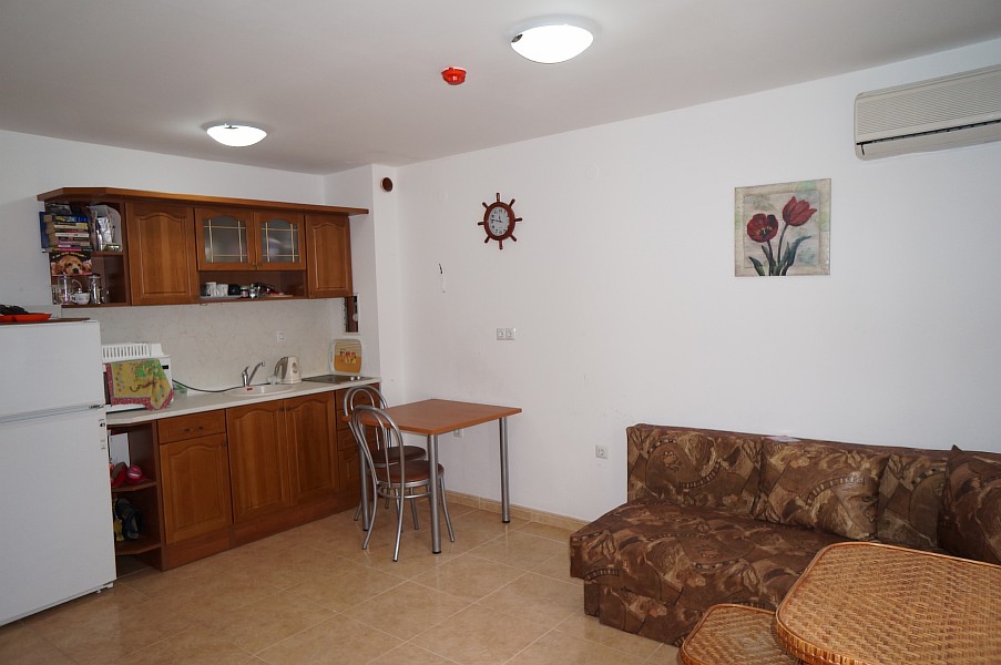 Zu verkaufen ist eine große 1-Zimmer-Studiowohnung mit einer Wohnfläche von 41 m², die im 3. Wohnstock im Komplex Etara 3 in Sveti Vlas liegt. Sie hat ein Wohnzimmer mit kleiner Küche, eine separate Schlafraumnische, ein Badezimmer plus Toilette und Terrasse. Die Wohnung ist voll möbliert und mit Haushaltsgeräten, Klimaanlage, Geschirr und Besteck ausgestattet. Sie ist sowohl für den Urlaub als auch für ganzjährige Bewohnung passend. Der Komplex ist ungefähr 200 Meter vom Meer, 800 Meter vom Zentrum von Sveti Vlas und nur 600 Meter vom Yachthafen Marina Dinevi entfernt.