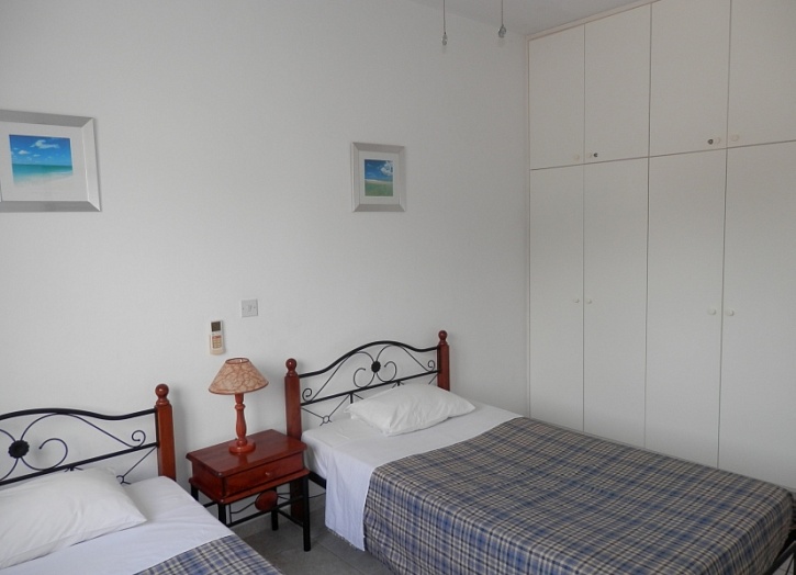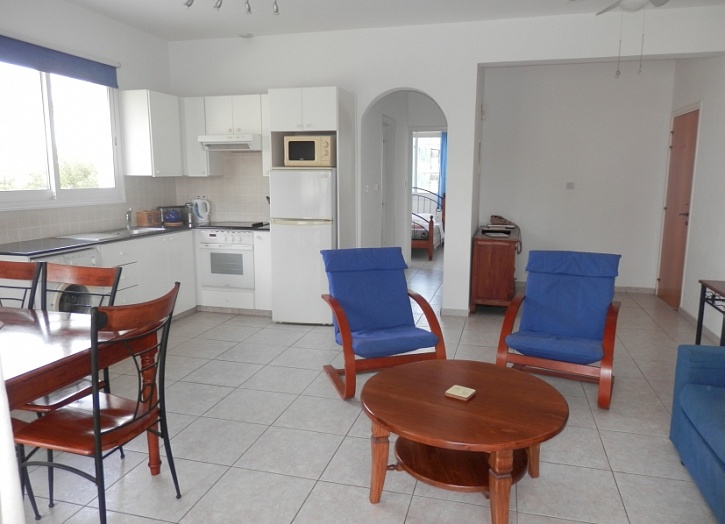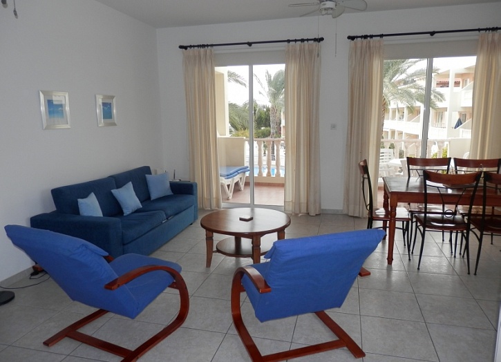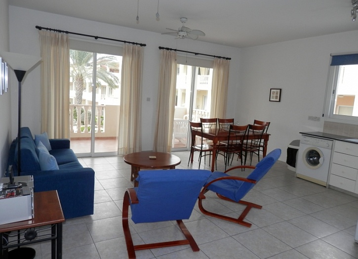 Апартаменты расположены на 2 этаже и состоят из открытого плана кухни, просторной гостиной с выходом на террасу с видом на бассейн и парк, ванной комнаты и двух спален. Квартире принадлежит просторная кладовка.