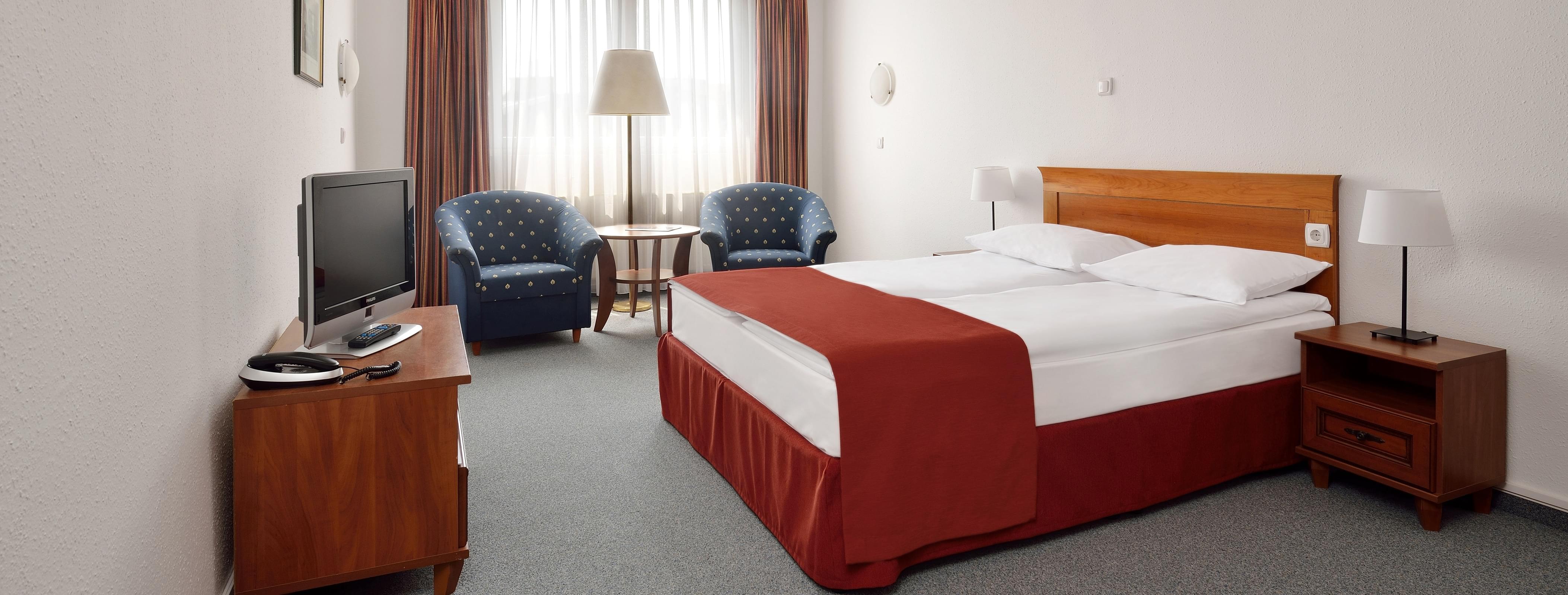 The Hotel offers 136 extremely spacious, well-equipped, comfortable rooms on 8 floors with a range of different room types for individuals, families, or groups visiting Budapest. All rooms feature en-suite bathrooms and are equipped with adjustable air-conditioning, satellite television, direct dial telephone. Minibar also available in various room. Three of our special rooms, each featuring a jacuzzi, offer pleasant relaxation. Due to their romantic design these rooms are recommended as honeymoon suites. All of the rooms are non-smoking.