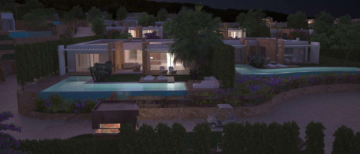 33 роскошных и гармоничных вилл с собственными дорогами контролируются активными и пассивными системами безопасности . Архитектура вилл включает в себя черты традиционного дома на Ибице и передовые технологии. В коттеджном поселке имеется все необходимое для комфортного проживания – спа, фитнес, садовники, охрана, консьерж, услуги химчистки, горничные.