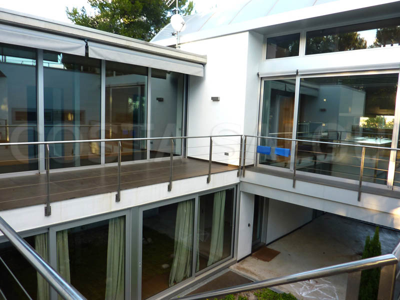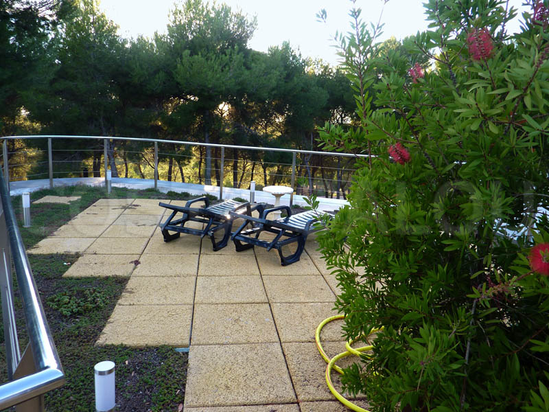Здание 2-этажное, салон – столовая площадью 60 кв.м, всего 5 спален, 2 из которых объединены с ванными комнатами с гидромассажным душем (типа «сюит»), есть ещё 3 спальни, для которых предусмотрена ванная комната с гидромассажным душем и также ванная комната с видом на бассейн и на сад, террасы общей площадью около 200кв.м. Кроме того в цокольном этаже имеются отдельные апартаменты с ванной комнатой в цокольном этаже для прислуги. Имеется бассейн, сад, внутренний дворик, гараж на 2-3 автомобиля. Установлено спутниковое телевидение, Wi-Fi, система кондиционирования «тепло – холод», камин. Дом полностью меблирован, оборудован бытовой техникой, оснащён всеми необходимыми принадлежностями для приятного отдыха, есть охранная сигнализация.