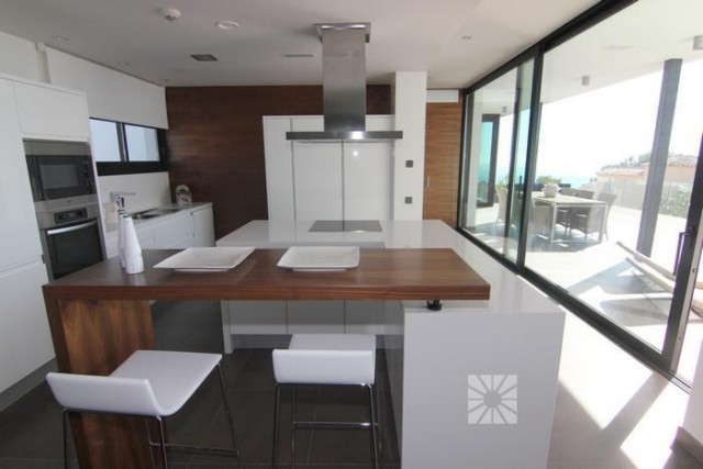 Строительство новой ультрасовременной виллы в эксклюзивном резиденциальном комплексе Jazmines, в районе Кумбре дельСоль, между Хавеа и Кальпе, в 5 минутах от Коммерческого Центра, 2 км до пляжа. Современный проект, приватный и безопасный, предназначен для удовлетворения самых взыскательных и требовательных. Недвижимость состоит из двух уровней: на нижнем этаже находится гараж, приблизительно 80 кв.м., вместимостью на 3-4 автомобиля, огромная кухня, по дизайн-проекту с эффектным островом в центре, которая сообщается со столовой, верандой и зоной барбекю, здесь же находятся кладовая, прачечная и туалетная комната. Несомненно, основное внимание притягивает салон-гостиная, где впечатляет шестиметровая высота потолков и стеклянные стены, которые позволяют наслаждаться солнечным светом и восхитительными видами на море. Отличительной деталью верхнего этажа является Главная спальная с приватной террасой 41 кв.м., которая впечатляет своими размерами, около 34 кв.м., и состоит из зоны отдыха, гардеробной и ванной комнаты, где есть джакузи и душевая кабина. на этом же этаже располагаются ещё три спальни, каждая из них имеет встроенный шкаф и ванную комнату en suite. Зону отдыха верхнего этажа завершает просторный салон-кинотеатр. Дополняет эту виллу ландшафтный сад, спроектированный из различных элементов: веранда, чтобы наслаждаться морским бризом, зона барбекю для пикников на открытом воздухе, огромная терраса, чтобы загорать, и великолепный бассейн “инфинити”, который сливается с бесконечностью Средиземного моря. На стадии строительства, возведены стены, сдача объекта летом 2013 года. Дом построен на участке 1.045 кв.м имеет общую площадь 587,55 кв.м. с полезной площадью 276, 55 кв.м Верандa 34.30 m2 Наружная терраса 117,70 m2 Гараж c пандусом и aвтомат-ворота 159 m2 Пергола 34,30 m2 2 холла Полностью мебелированная кухня Столовая 4 спальни 5 С/Узлов Бассейн-Инфинити с подсветкой, поверхность воды 65,60 кв.м. Стены по периметру из натурального камня Солнечные панели Аудиосистема Динамики интегрированные в потолках установлены в кухне, спальнях и ванной комнате, от B & W или аналогичной марки, проигрывание multi-room аудиосистемы с помощью дистанционного управления. Кинотеатр Предварительная установка для кинотеатра в гостиной, в соответствии с планом. Мультирум аудиосистема SONOS или аналогичной марки, с использованием различных аудио источников, подключенных к сети Ethernet: компьютеры, плееры, мультимедийные жесткие диски, интернет-радио, интернет услуги и т.д. Солнечные коллекторы Солнечные панели для производства горячей воды в соответствии с действующими нормами. Вентиляция Система вентиляции жилья с помощью установки решетки воздухозаборника Видеонаблюдение Система видеозаписи интегрирована в системы домашней автоматизации, состоящая из 4 внешних камер, просмотр записей с любого компьютера, подключенного к сети дома. Кондиционирование Термостаты для индивидуального регулирования температуры в каждой комнате, интегрированы в системе Умный Дом. Контроль Главная Система автоматизации контролируется с помощью электрических переключателей и domotic колодки, 12" цветной сенсорный экран, установленный на стене, пульт дистанционного управления с сенсорным экраном, с любого компьютера, подключенного к сети, из Интернета и с мобильных телефонов, если они настроены. Общие Г