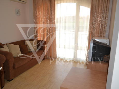 Here we offer to you a fully furnished, resale apartment with entrance hall, living room with kitchenette, bedroom, bathroom and balcony. It is located on the ground floor and has an area of 51 square meters. It is overlooking the pool and facing west, which means that it is sunny and bright in afternoons. The apartment has a kitchenette with oven, hob, extractor, fridge, microwave, washing machine, sofa-bed, coffee table and a TV set in the living room, double bed with bedside cabinets, dressing table and wardrobe in the bedroom. There is a dining table with four chairs, wich are now placed in the entrance hall. Access to the balcony is from the living room only. There is one air-conditioner in the living room and direct exit to the garden through a few steps from the balcony.
