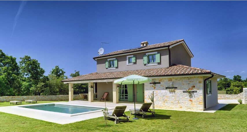 Detached house, new built, 2010. It's located in southern area of central Istria, 10 km from the sea, 16 km from airport, in small village between Svetvinčenat and Vodnjan.