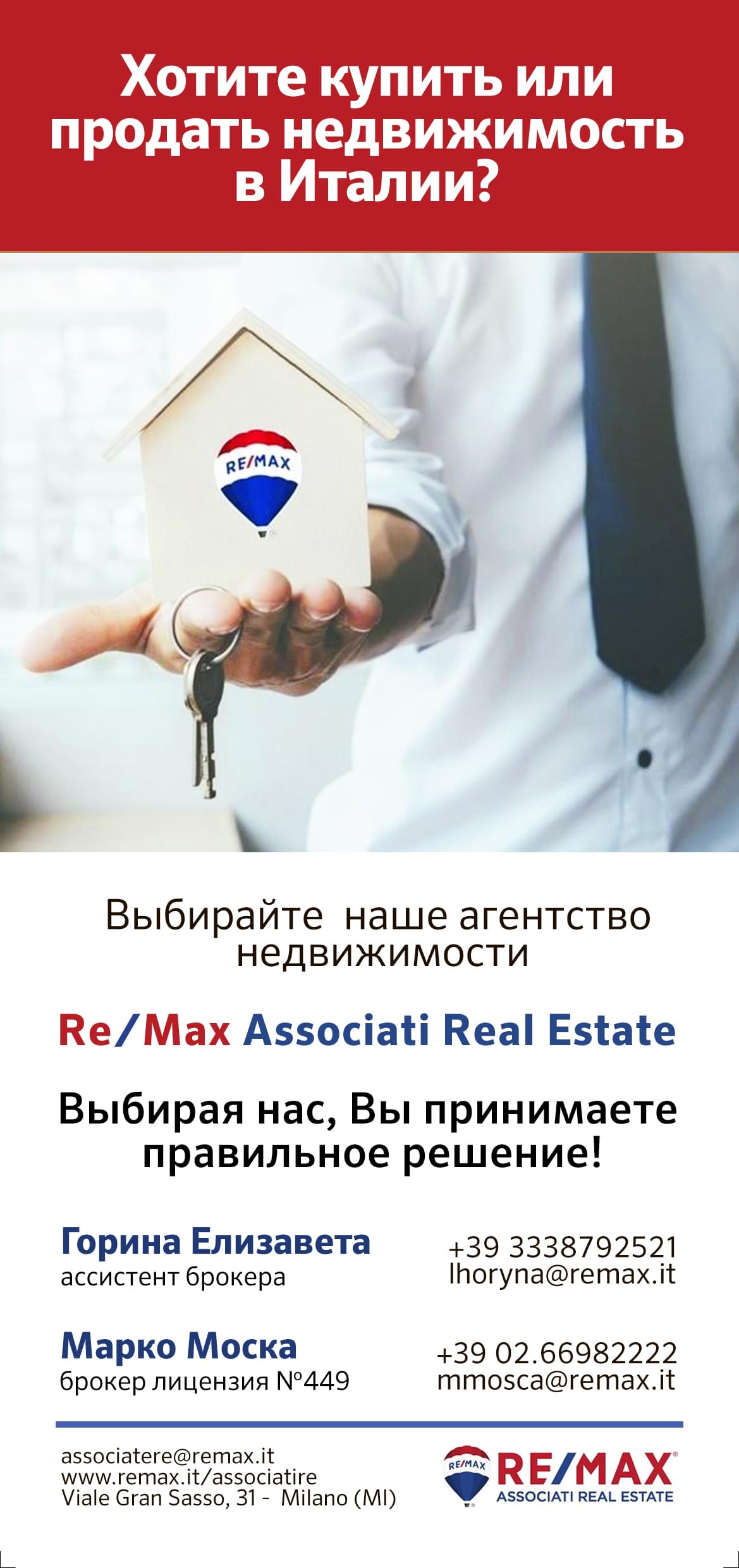 RE/MAX – это крупнейшая международная сеть агентств по торговле недвижимости , более 40 лет на мировом рынке и уже 20 лет на рынке недвижимости в Италии. На территории Италии RE/MAX имеет более 200 филиалов, одна общая база недвижимости по всей Италии, что позволяет, подобрать для Вас варианты любой недвижимости в любом уголке Италии за несколько минут, автоматическая рассылка MLS новых предложений недвижимости по вашим критериям поиска. Мы, агентство недвижимости Re/Max Associati Real Estate S.R.L., являемся одним из филиалов RE/MAX в Италии и будем рады предложить наши услуги по всем видам операций с недвижимостью. Главное правило нашей работы — оказывать максимальное внимание нашим клиентам. Индивидуальный подход к каждому клиенту, является основой успеха компании RE/MAX. Мы гарантируем: открытость и прозрачность всех операций, полное сопровождение сделок (нотариус, кадастровое агентство, ипотека, консультация архитектора, получение необходимых сертификатов на недвижимость), предлагаем весь спектр услуг для приобретения и продажи недвижимости в Италии. Если же, вы решили продать недвижимость, вы можете связаться с нами и получить бесплатную консультацию, оценку вашей недвижимости, всесторонний анализ рынка и маркетинговое планирование продаж. Юридическое сопровождение на всех этапах покупки недвижимости