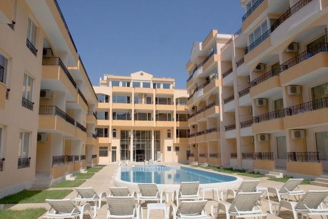 Апартамент в уютном 5-этажном комплексе в Солнечный берег, в 500 м от побережья Черного моря, рядом с аквапарком. Апартаменты меблированы: ванная комната, встроенная кухня, терраса. С террасы вид на басейн, сад и лужайки. В комплексе охрана, парковка...